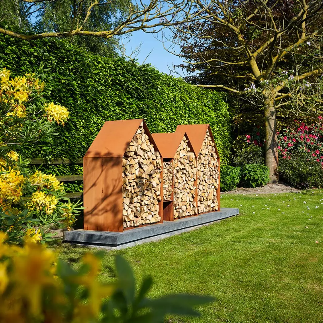 De Bruges houtopslag is vervaardigd uit 3 mm dik cortenstaal en wordt geleverd als DIY bouwpakket in ongeroeste staat. Na verloop van tijd ontwikkelt het staal zijn kenmerkende roestlaag, waardoor de houtopslag mooi opgaat in de buitenomgeving.
