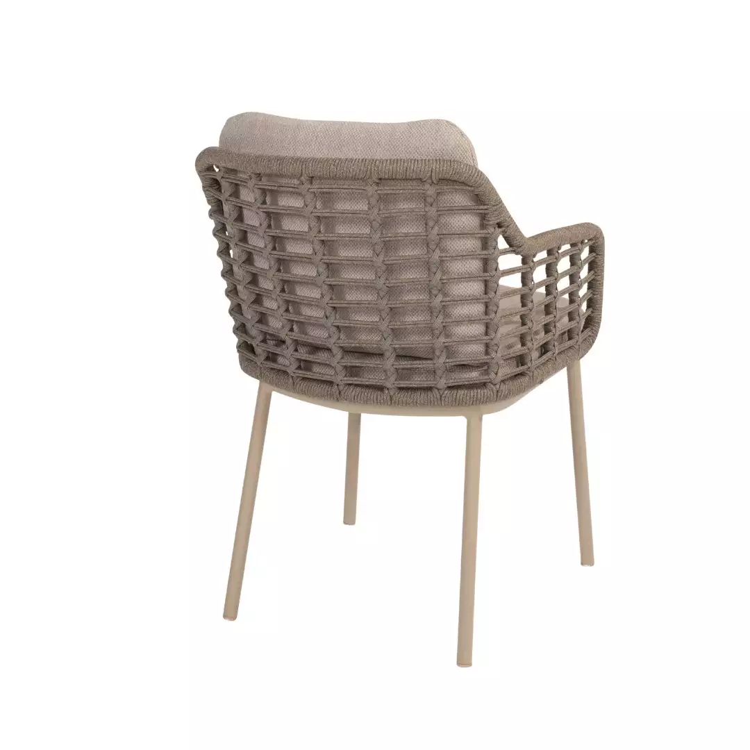De Puglia armstoel van Taste 4SO combineert verfijnd design met duurzame materialen. De stoel is vervaardigd uit een elegante combinatie van rope en aluminium en wordt geleverd inclusief twee weerbestendige kussens voor optimaal comfort.