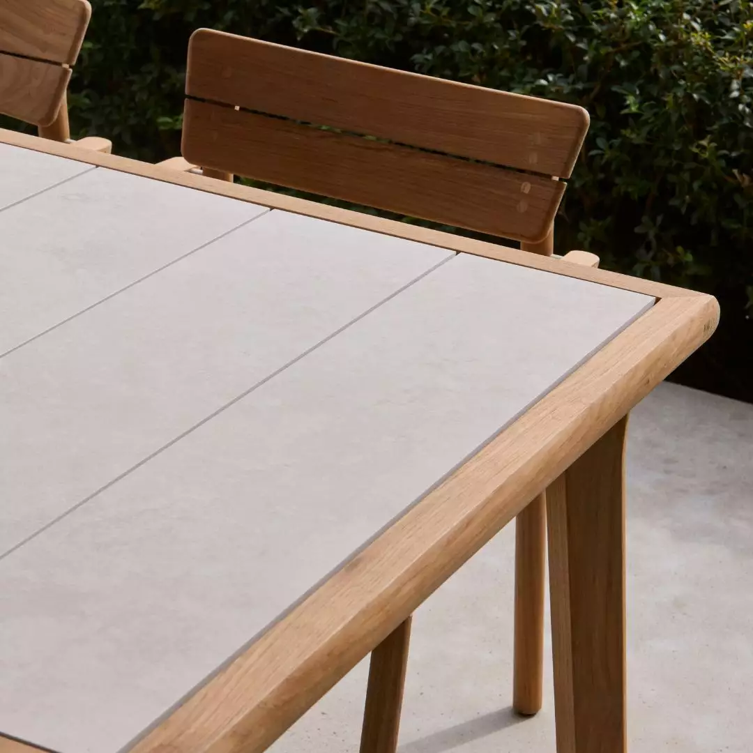 De combinatie van warm teak en strak keramiek zorgt voor een perfect evenwicht tussen natuurlijke charme en hedendaags design. Hierdoor past de Lynn eettafel moeiteloos binnen zowel moderne als klassieke buitenomgevingen en laat ze zich prachtig combineren met teak, wicker of aluminium diningstoelen.